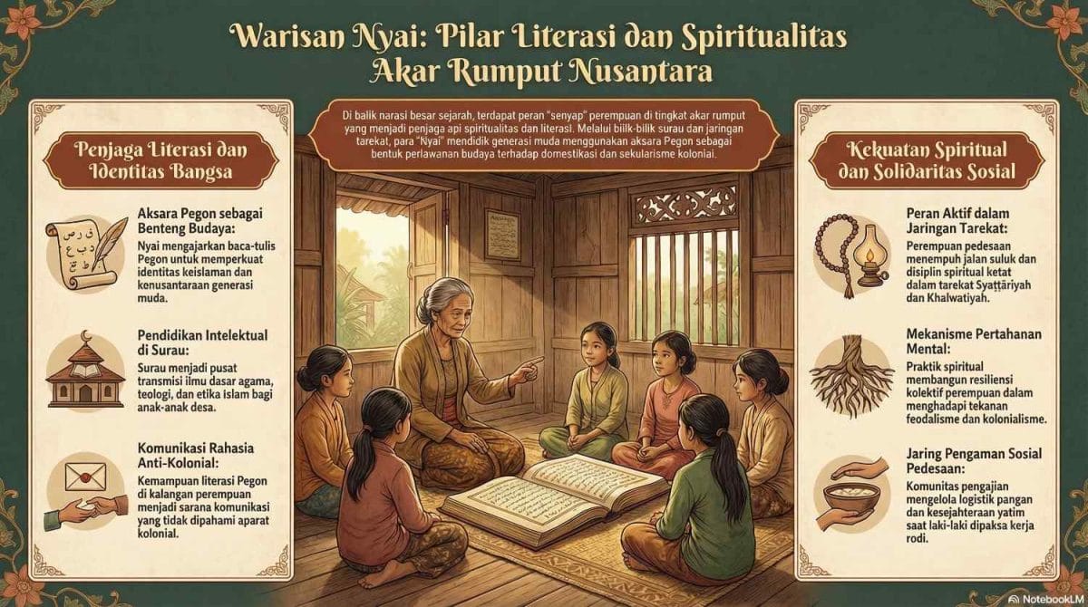 Penjaga Literasi dalam Senyap. Jauh dari hingar-bingar politik istana, para ulama perempuan dan ‘Nyai’ di pedesaan menjadi benteng pertahanan budaya melalui pengajaran aksara Pegon dan nilai-nilai Islam.